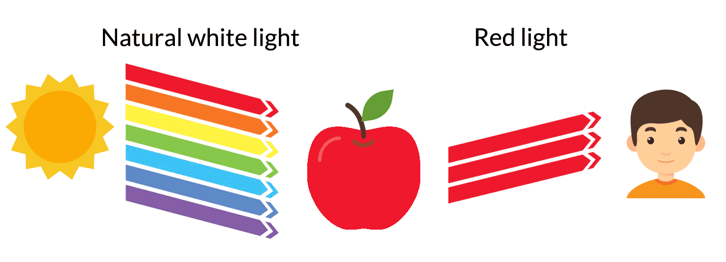 Во-первых, быстрое обновление того, как работает цвет. Естественный свет, такой как солнечный свет, представляет собой сочетание всех цветов видимого спектра. Цвет самого солнечного света белый, но цвет объекта под солнцем определяется цветами, которые он отражает.