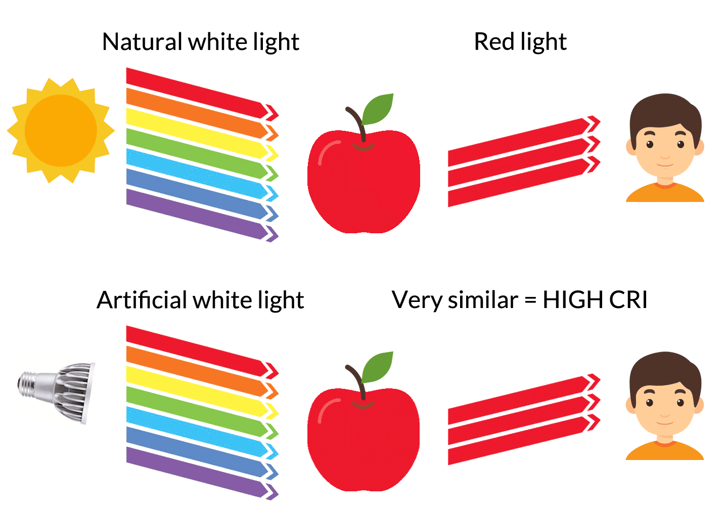 Например, красное яблоко выглядит красным, потому что оно поглощает все цвета спектра, кроме красного, которое оно отражает. Когда мы используем искусственный источник света, такой как светодиодная лампа, мы пытаемся «воспроизвести» цвета естественного дневного света, чтобы объекты выглядели так же, как при естественном дневном свете.