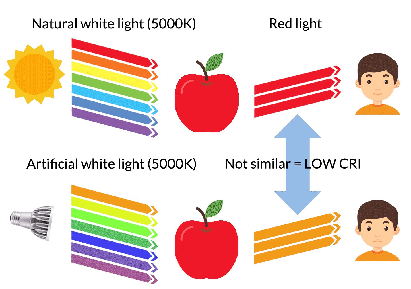 Как вы можете видеть в нашем примере выше, наш искусственный источник света (светодиодная лампа с 5000K CCT) не воспроизводит такое же покраснение в красном яблоке, как естественный дневной свет (также 5000K CCT). Но обратите внимание, что светодиодная лампа и естественный дневной свет имеют одинаковый цвет 5000К. Это означает, что цвет света одинаков, но объекты по-прежнему выглядят по-разному. Как это могло произойти?