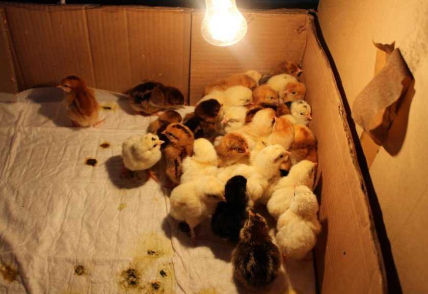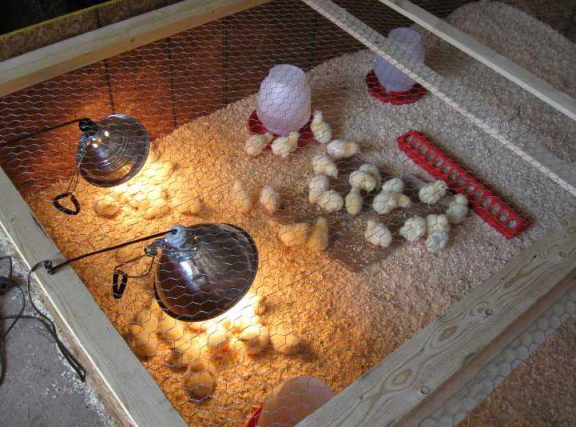 Некоторые уверены, что в первые 20 дней жизни цыплят следует применять лампы с красной колбой, чтобы уменьшить стрессовые факторы для молодняка. Проводку необходимо прокладывать по наружной части клетки. Рекомендуется использовать светильники с защитной решеткой, чтобы защитить цыплят от ожогов, а стекло – от повреждений.