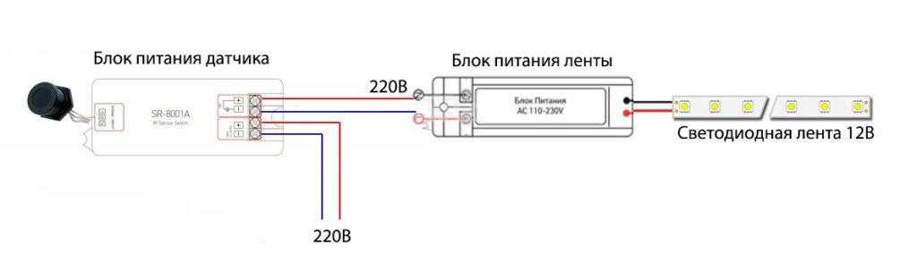 Выбор питающей системы зависит от доступности подключения общей сети. Если место слишком неудобное для протяжки проводов питания, то может использоваться светодиодная лента на батарейках с датчиком движения. Сенсор зачастую, в таких случаях, уже идет в комплекте и находится на корпусе блока, в котором размещены аккумуляторы.