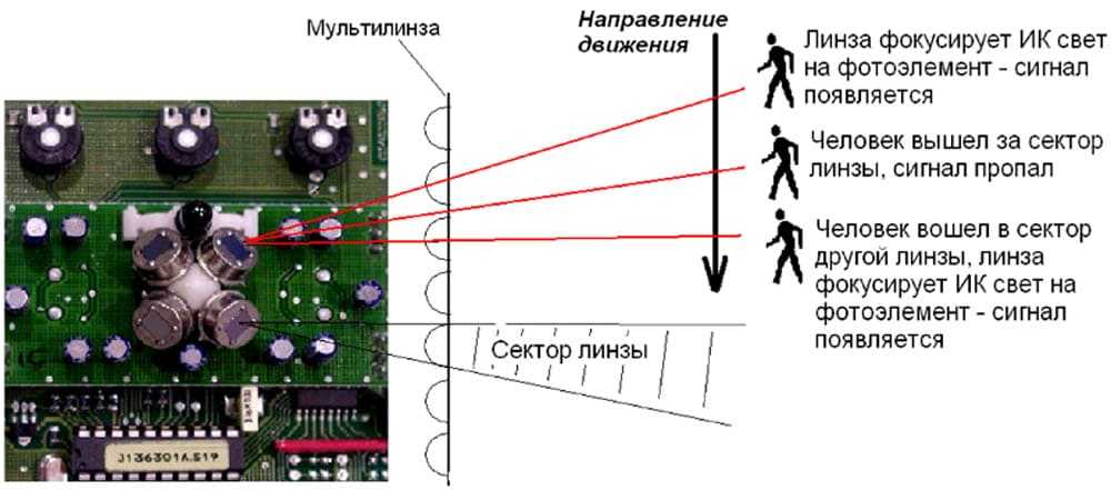 Работа инфракрасного датчика (ИДД) построена на регистрации изменений теплового фона окружающего пространства. Все живые организмы излучают тепло в инфракрасном диапазоне. Основной частью ИДД является пироэлектрический элемент (линза Френеля).