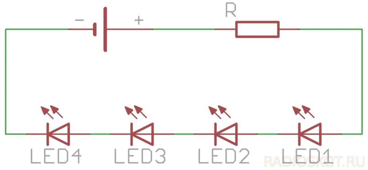 Параллельное подключение светодиодов — идеальный вариант. Всегда стремитесь к тому, чтобы подключать светодиоды параллельно и ограничивать ток каждого светодиода по отдельности своим резистором. Если вы используете светодиодные драйверы (стабилизаторы тока), то каждому светодиоду нужно подключать свой драйвер. Именно поэтому параллельные схемы с большим количеством светодиодов становятся слишком дорогими. В реальности приходится идти на компромисс и объединять светодиоды в цепочки.