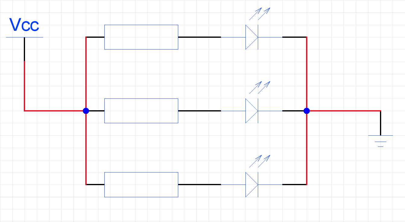 Ниже приведен единственно верный вариант параллельного включения светодиодов. Здесь последовательно с каждым светодиодом подключен ограничительный резистор. Такое схемотехническое решение позволяет выровнять токи в каждой отдельной ветви, не позволяя им превышать рабочее значение.