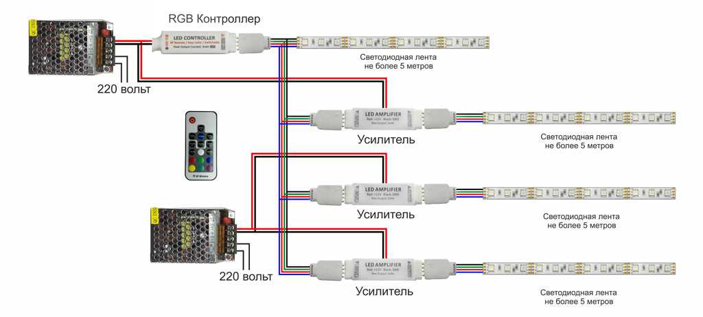 Вот наиболее применяемые схемы подключения RGB усилителей. Светодиодная подсветка длиной 20 метров: