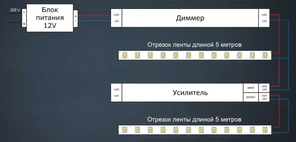 Наибольшая мощность производимых контроллеров обычно не превышает 200 Вт, что поддерживает не более 10 м LED изделия. Для подключения большей длины применяется усилитель. Для питания усилителя используется силовой блок, который устанавливается отдельно. Можно рассчитать нагрузку для подключения и от одного адаптера, который питает ленту, но как показывает практика, лучше использовать отдельный блок.