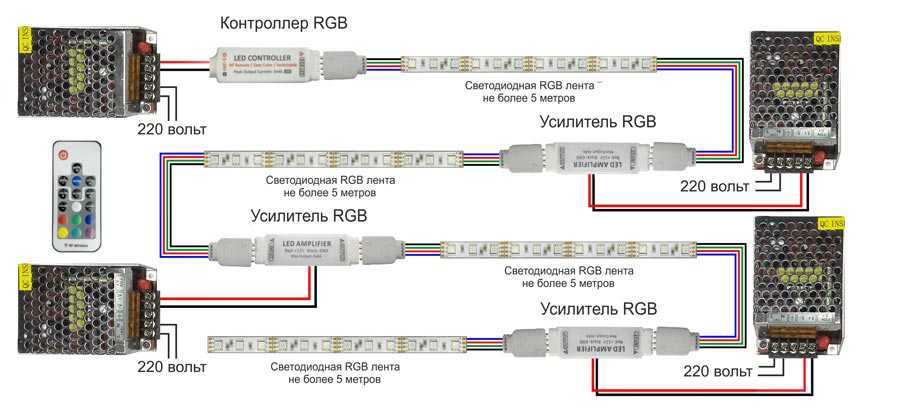 А если мощности RGB контроллера не хватает, чтобы подключить все освещение (больше 20 метров)? Можно установить 2 контроллера, но управлять светом одной комнаты придется с двух пультов, что не удобно и дорого. Второй (правильный) вариант — использовать RGB усилитель.