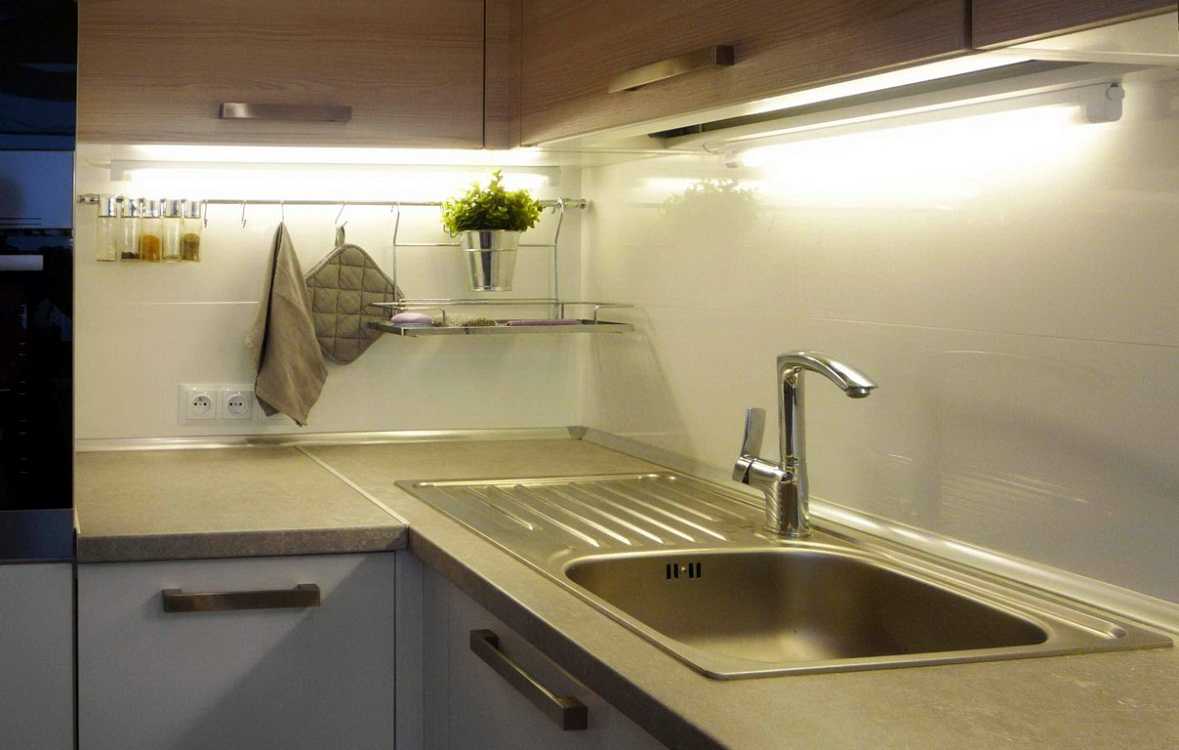 Самый сложный, но доступный всем — встройка спотов. Врезаются непосредственно в шкафчик и подключаются к сети через заранее проложенный канал. Придется помудрить, но зато в ваших шкафчиках всегда будет светло.