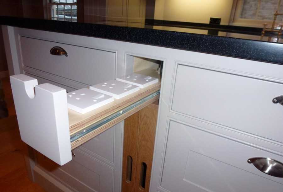 Выдвижные блоки розеток. Довольно интересный с практической точки зрения вариант. Может быть прекрасной альтернативой электрическому удлинителю. Позволяет подключать одновременно несколько электроприборов, что очень удобно, особенно на кухне. В большинстве случаев эти розетки размещаются в шкафчиках, дабы не допустить попадания влаги и пыли.