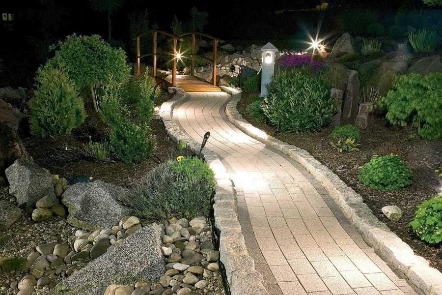 с помощью освещения можно зонировать просторный участок, а на небольшой территории визуально расширять границы