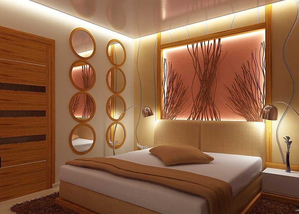 Если в стене имеется ниша для одежды или для изголовья кровати, поблизости или по параметру можно пустить светодиодную ленту или другие источники дополнительного освещения, дающие возможность разнообразить интерьер спальни или собираться на работу, не беспокоя вашего супруга (супругу), если его (ее) рабочий график не совпадает с вашим.