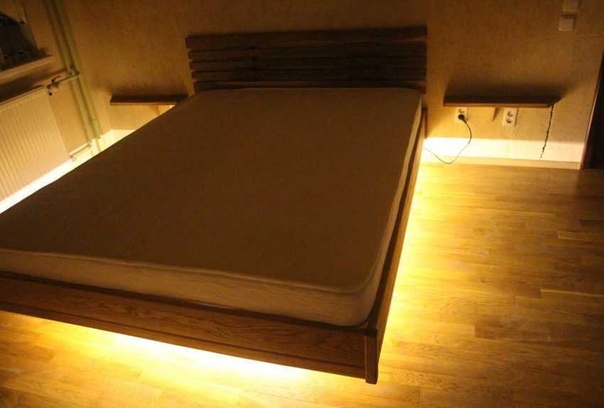 Сейчас можно заказать и купить кровать с самыми разными вариантами подсветки. Но вполне возможно создать подсветку в спальне своими руками. Например, эффект парящей кровати достигается совсем несложным способом. Очень просто монтируется подсветка в спальне светодиодной лентой – она крепится по периметру кровати в нижней ее части.