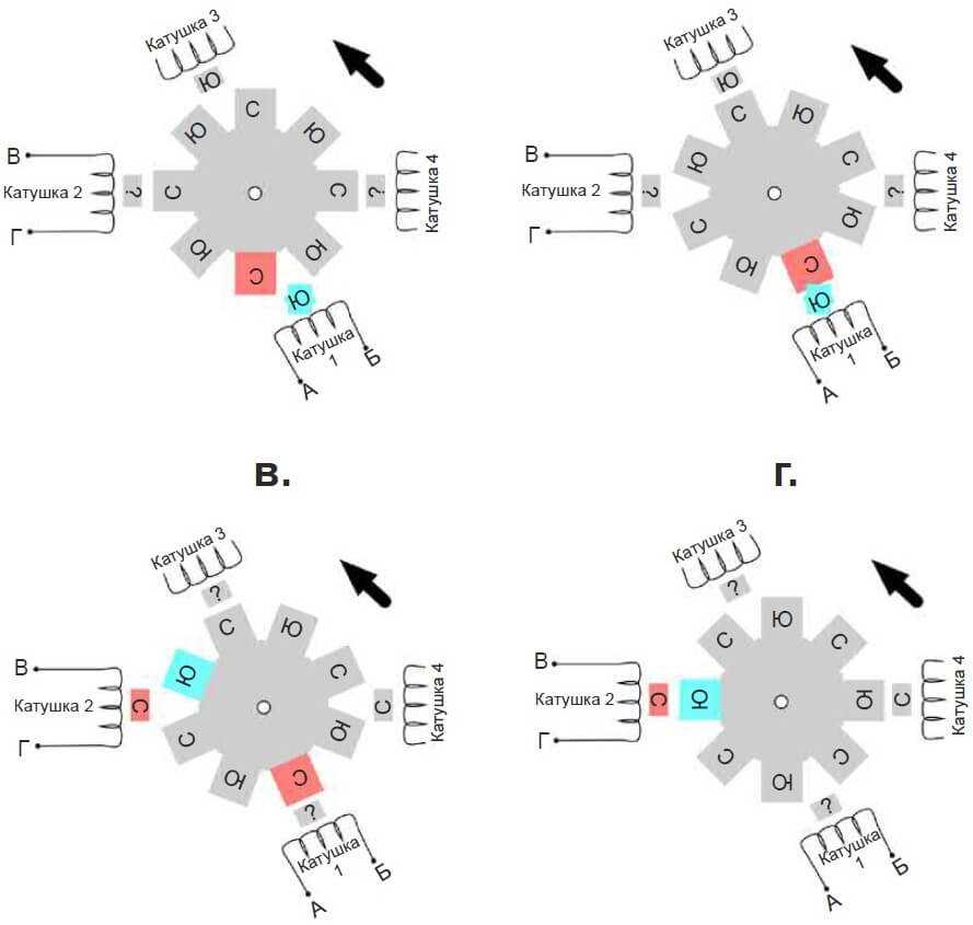 Начнем с варианта рисунка под буквой «а» — когда катушка 1 , а значит, и катушка 3 запитаны так, что становятся южными полюсами (Ю), вследствие того, что разноименные полюса притягиваются, а одноименные отталкиваются, ротор поворачивается против часовой стрелки до тех пор, пока ближайшие зубцы ротора с намагниченностью северного полюса (С) не поравняются с катушками 1 и 3 (как показано на «б»).Чтобы продолжить вращение против часовой стрелки, на следующем шаге (рисунок «в») необходимо подать ток в катушки 2 и 4 так, чтобы они стали северными полюсами (С). Тогда ближайшие зубцы ротора с намагниченностью Ю подтянутся к катушкам 2 и 4 (рисунок «г»).