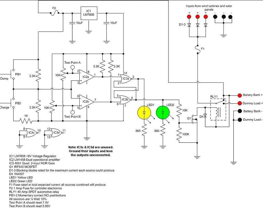 На изображении ниже вы увидите схему такого электрооборудования. Для того чтобы собрать его потребуются небольшие познания в электроники и немного терпения. Конструкция немного доработана и теперь вместо диода установлен полевой транзистор, регулирующийся компаратором. Такой контролер заряда будет достаточен для использования в сетях не высокой мощности, с использованием только . Отличается простотой изготовления и дешевизной материалов.
