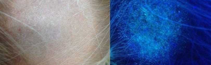 - стригущий лишай — светится под лампой Вуда ярко-зеленым свечением. Однако следует учитывать, что некоторые возбудители микроспории не флюоресцируют;