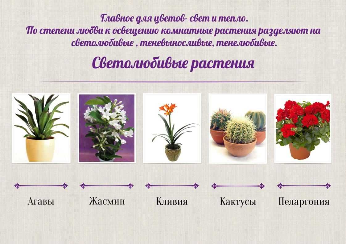 К наиболее светолюбивым видам относятся мирт, ананас, розы, каланхоэ, молочай, цитрусовые культуры, бокарнея, бугенвиллия, кордилина южная, гибискус, питтоспорум, суккуленты, юкка, акация, олеандр. Им требуется высокая интенсивность освещения – от 4000 лк.