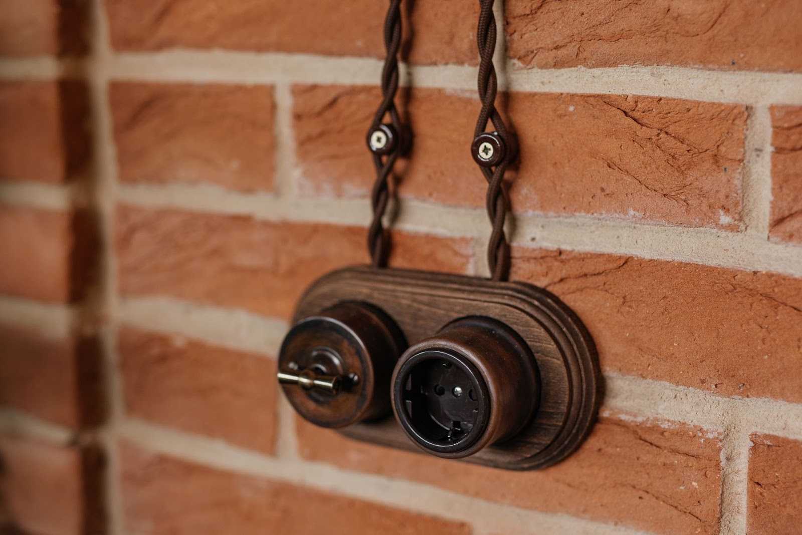 В домах из бруса или оцилиндрованного бревна для сохранения ретро стиля используют открытый способ прокладки проводов, приобретая декоративную продукцию – скрученную проводку, ролики, стилизованные выключатели и розетки