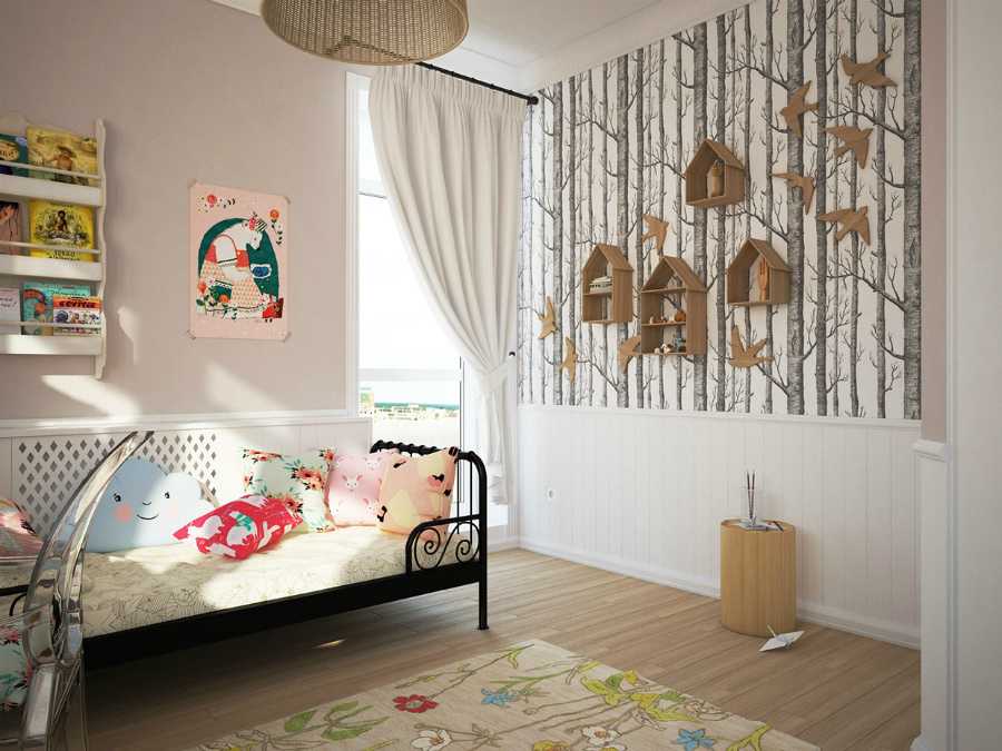 В детской лучше повесить светильник, к которому прикреплены фигурки парящих в воздухе птиц, малыши с удовольствием будут их рассматривать. Вечером птички отбрасывают на стены и потолок причудливые тени.