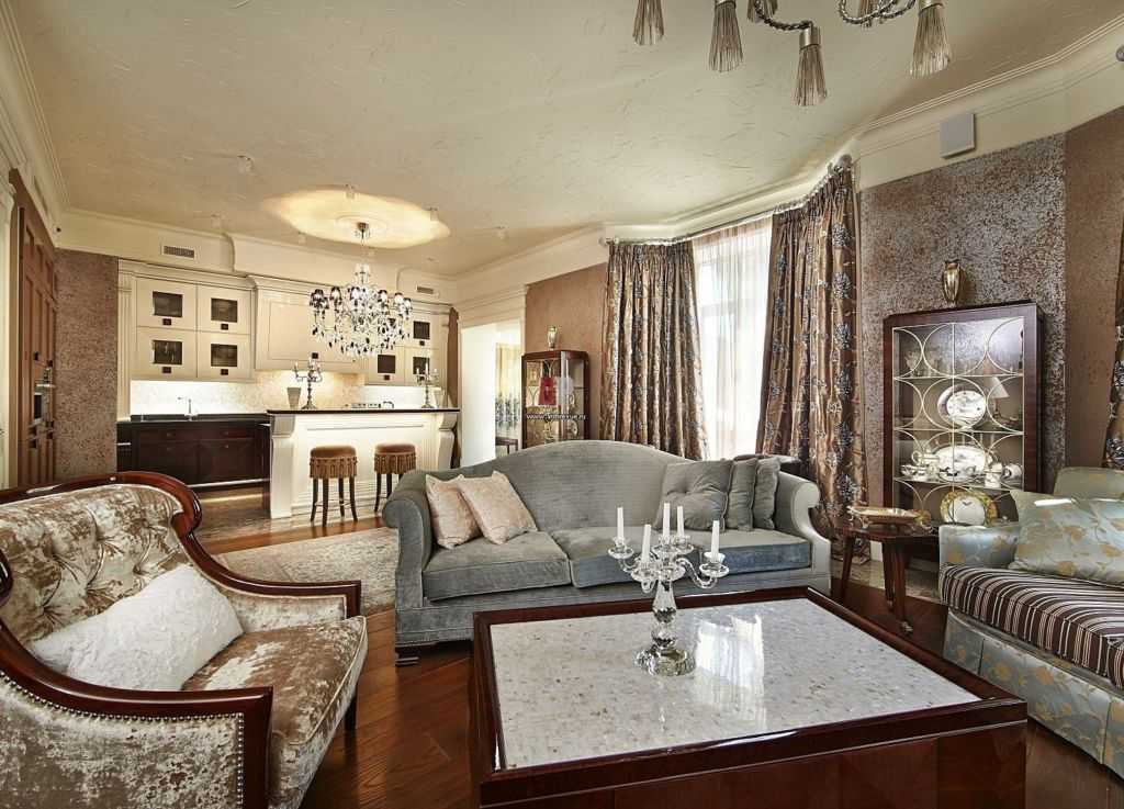 Для любого классического интерьера гостиная – это место, где собирается вся семья и гости, поэтому вся обстановка должна быть комфортной. Основное условие в оформлении – максимальное количество света и простора: пространство часто объединяют с кухней.