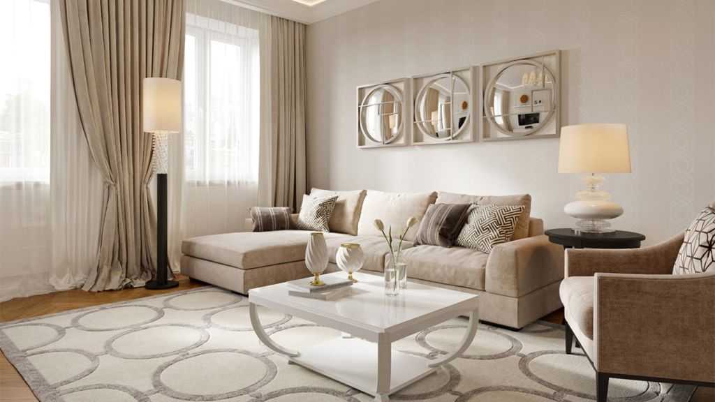 Если хочется, чтобы белый цвет тоже ощущался в доме, такой вариант оформления гостиной подойдет тем, кто не может выбрать между бежевым и белым. Эти цвета можно соединять, получая нежнейшее пространство, уютное и стильное. Зеркальные декоративные элементы на стене выглядят оригинально и респектабельно, а декор подчеркивает отличный вкус хозяев. Для просторной гостиной – идеальное оформление.