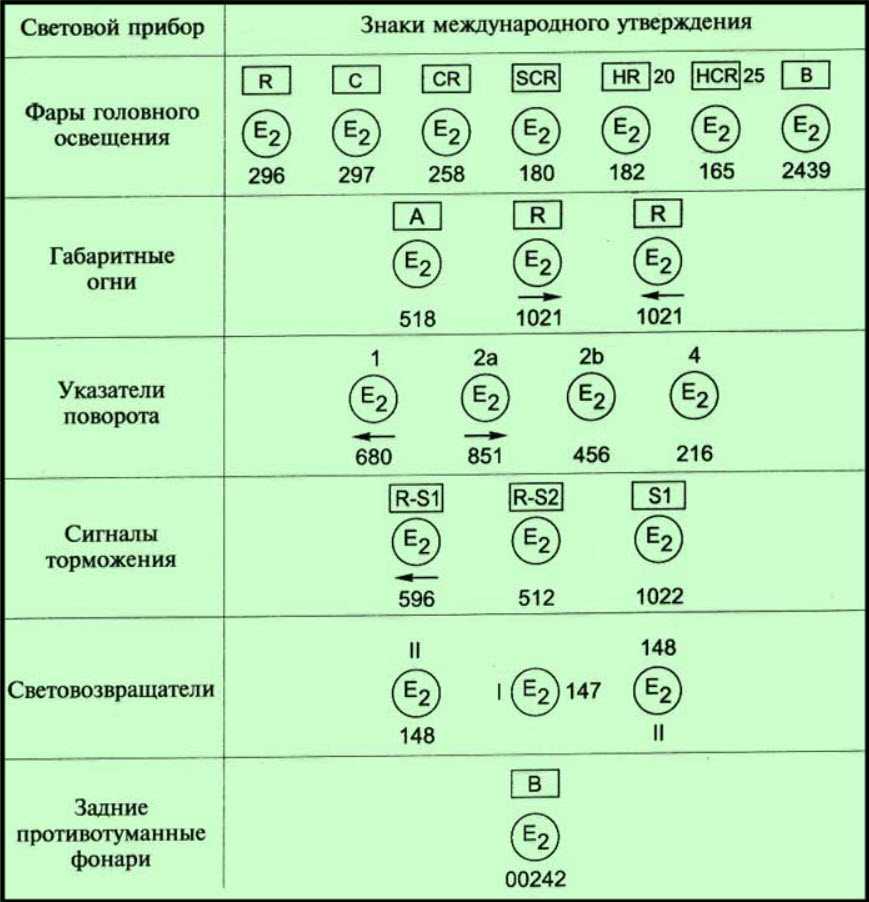 - Место расположения прибора и направление его действия кодируется символами A, B, C, R и их сочетаниями вроде CR, C/R, где A означает головной или боковой свет, B – противотуманное освещение, C и R соответственно ближний и дальний свет, при совместном использовании — комбинированный прибор.