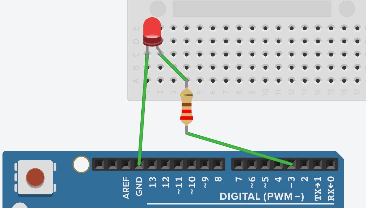 Для переключения светодиода кнопкой Ардуино соберите схему, как на изображении выше