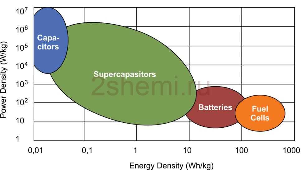 Плотность мощности — параметр, выражаемый в единицах мощности на килограмм массы источника [Вт / кг], намного выше для суперконденсаторов, чем для обычных электрохимических батарей. Высокое значение плотности мощности означает, что даже небольшой суперконденсатор способен подавать относительно высокий ток на потребитель — это связано с очень низким сопротивлением ESR. Сравнение различных типов источников тока в плане энергии и удельной мощности показано на рисунке.