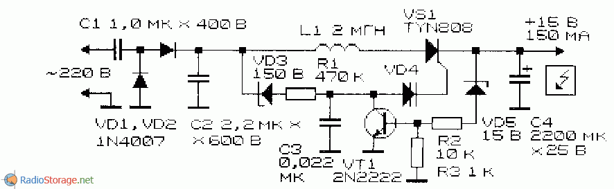 Рис. 25. Вариант схемы понижающего преобразователя напряжения с сетевым бестрансформаторным питанием.