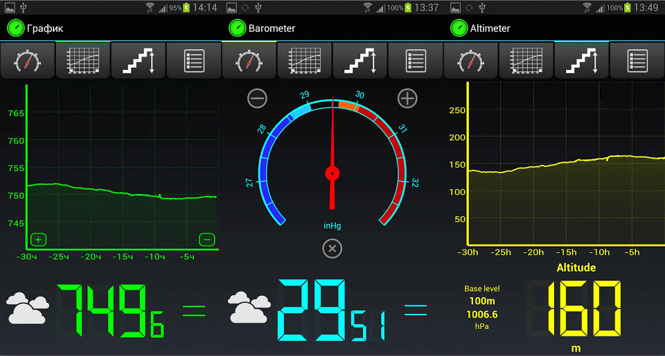В приложении любую из функций можно настроить предельно точно. Например, для того, чтобы получать более достоверные метеосводки, следует указать базовые величины измерений для своего местоположения, а для высотомера (альтиметра) – высоту над уровнем моря. На графике изменения давления можно задать желаемый период отображения (от 6 до 48 часов).