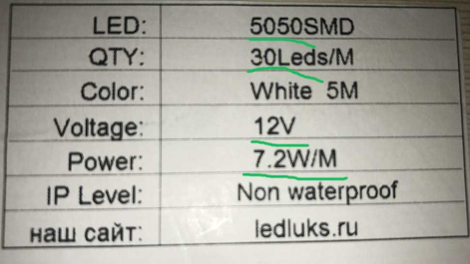 Значение мощности 1 м Led ленты зависит от типа светодиодов, которые на ней размещены, и их количества. Если паспорта нет или значение не указано (не все производители отличаются высоким уровнем ответственности), нужно отмерить метр рулеткой, определить длину и ширину чипов и посчитать, сколько их установлено.