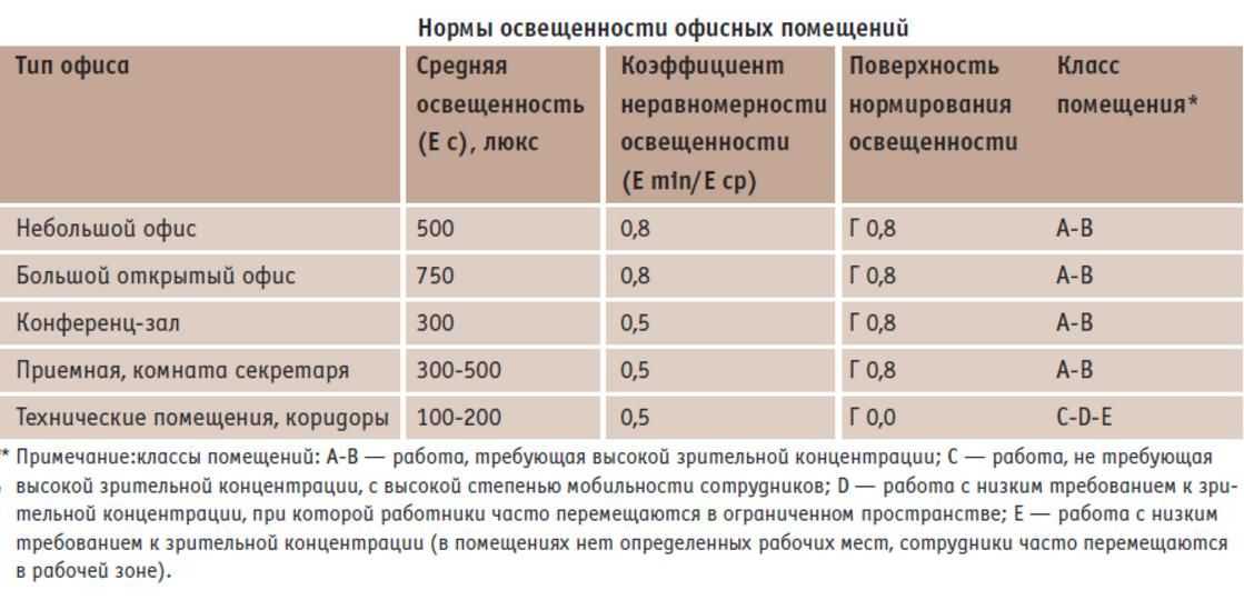 Таблица освещенности в Люксах для офисных помещений по СНиП (СП)