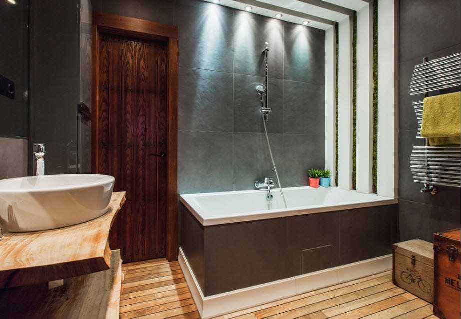 | Подсветка стен при темном потолке исправит положение в высокой и небольшой по площади ванной комнате сталинки. | |