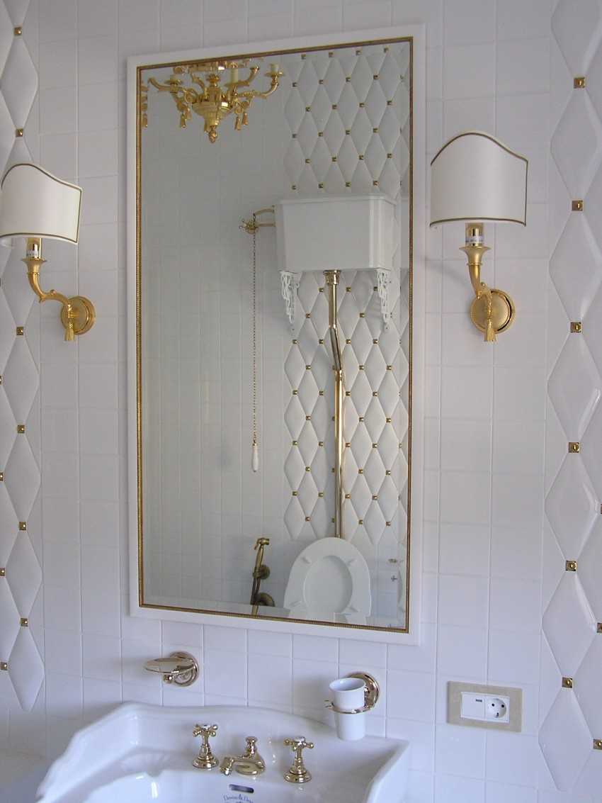 Английский стиль, о котором мы писали ранее, идет еще дальше и предлагает повесить в ванной комнате роскошную хрустальную люстру, а на стенах расположить бра в том же стиле. Идея довольно-таки спорная с практической точки зрения, но смотрится это очень красиво.