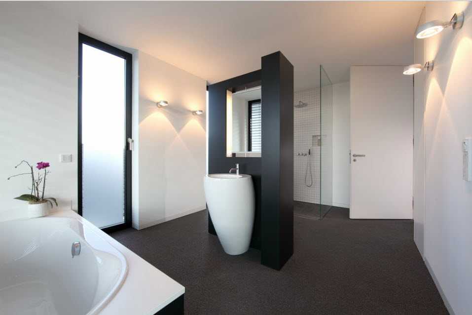 Освещение, как правило, расположено на потолке (в более редких случаях на стенах), но это далеко не единственный вариант размещения. Довольно необычно и интересно будет смотреться подсветка на полу комнаты — она рассчитана скорее на передачу рассеянного, чуть приглушенного света, что позволит вам расслабиться в ванной после тяжелого дня.