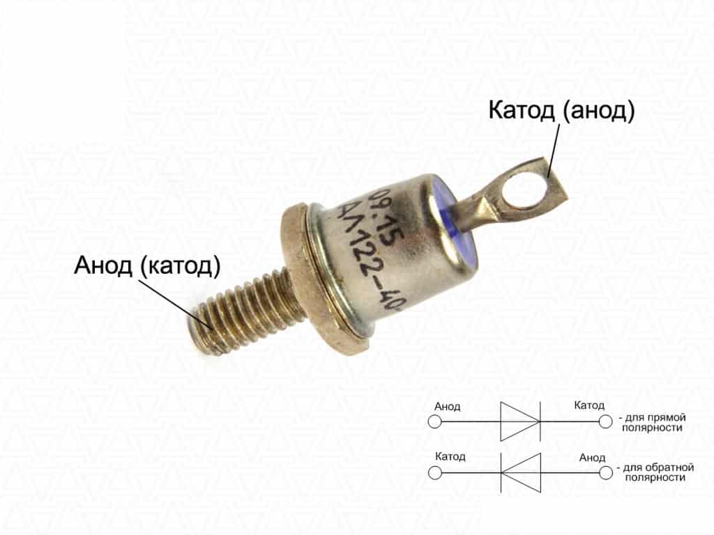 На корпусе таких диодов можно найти конструктивный срез. Именно он указывает на отрицательный контакт (катод). С противоположной стороны, соответственно, будет расположен положительный анод.