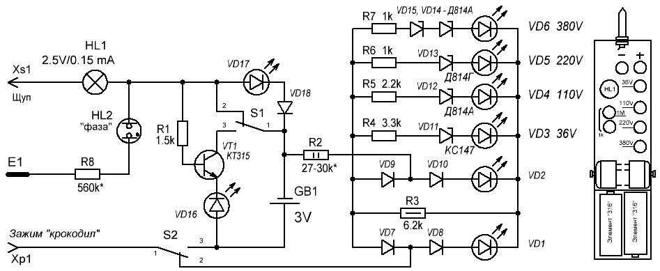 Подключим один щуп к одному гнезду розетки, а второй — ко второму. Или самому собрать простейшую «моргалку» на двух биполярных транзисторах. Что лучше выбрать Все устройства имеют свои плюсы и минусы, которые надо учитывать при их покупке. При однополярном подключении отвертки к токонесущему фазовому проводнику и касании пальцем сенсорной площадки неоновая лампа засветится, сигнализируя о наличии сетевого напряжения. Светодиод включается последовательно с батарейкой через канал полевого транзистора.