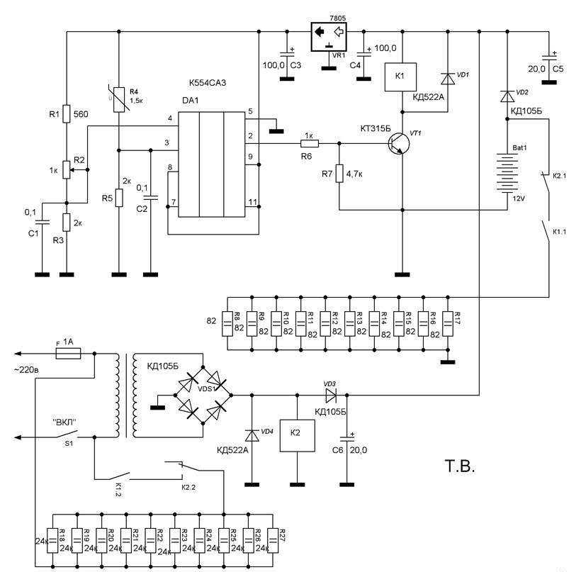 Используемое в схеме реле является многоконтактным (типа МКУ). В упрощенном исполнении (без аккумулятора) можно воспользоваться автомобильным реле
