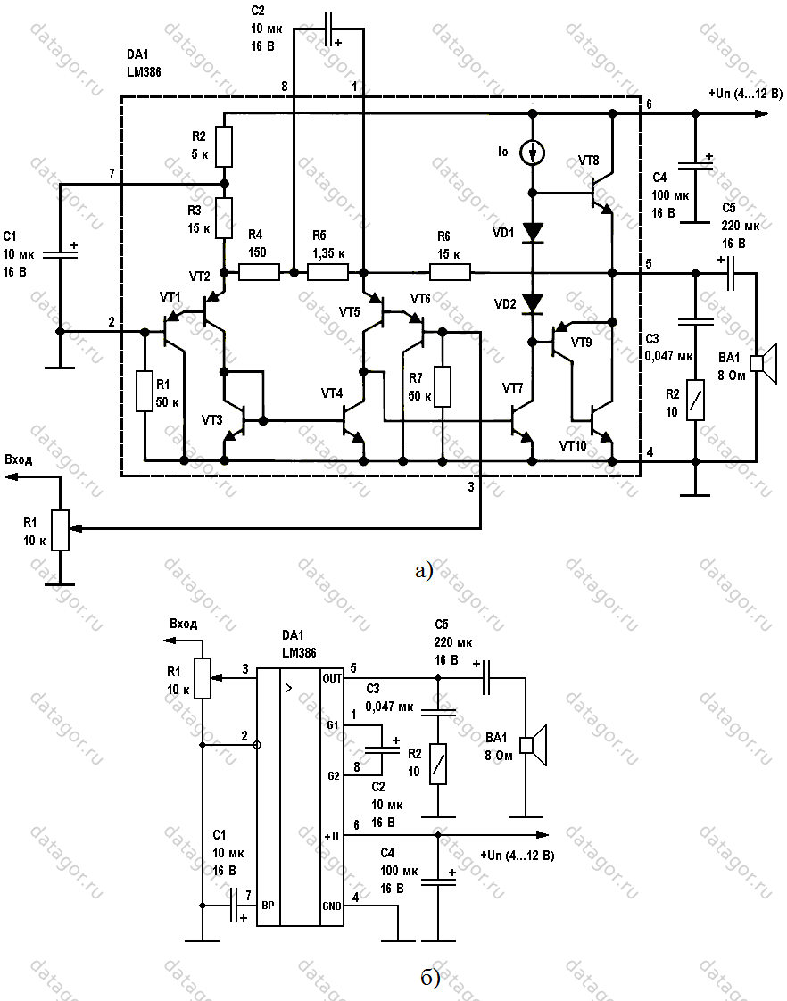 Принципиальная схема усилителя с коэффициентом усиления Ku=200 (46 дБ), изображена на рис. 2 а, б. На первом из них (рис. 2 а) показана функциональная схема ИС LM386, позволяющая лучше понять работу усилителя, а на втором (рис. 2 б) микросхема изображена в виде «чёрного ящика», по ней легче выполнять разводку печатной платы и проверку правильности установки смонтированных на ней элементов.
