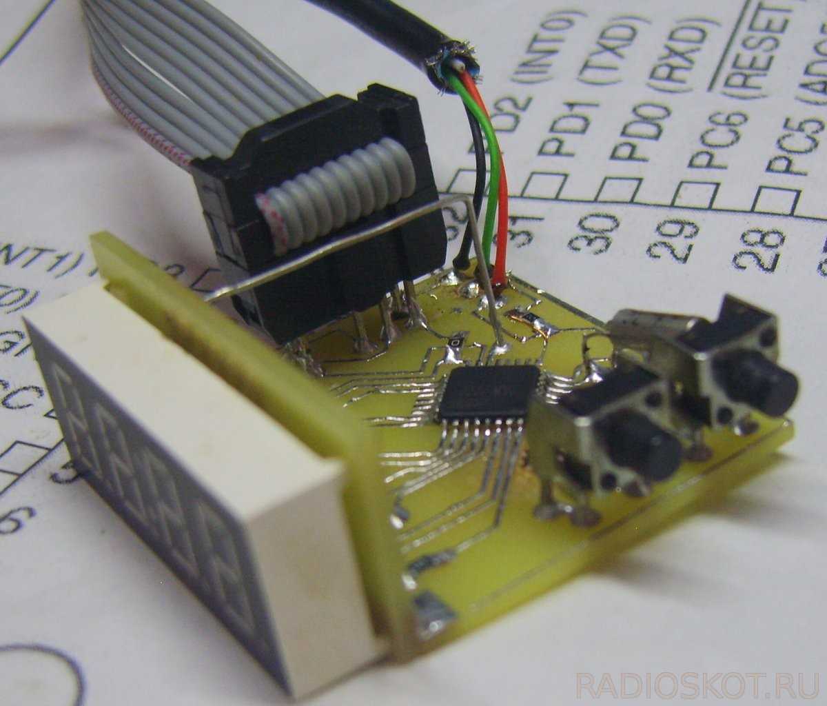 | Рисунок 6. | Микроконтроллер Attiny2313, разъем внутрисхемного программирования и перемычки для подключения выводов сегмента десятичной точки индикатора |