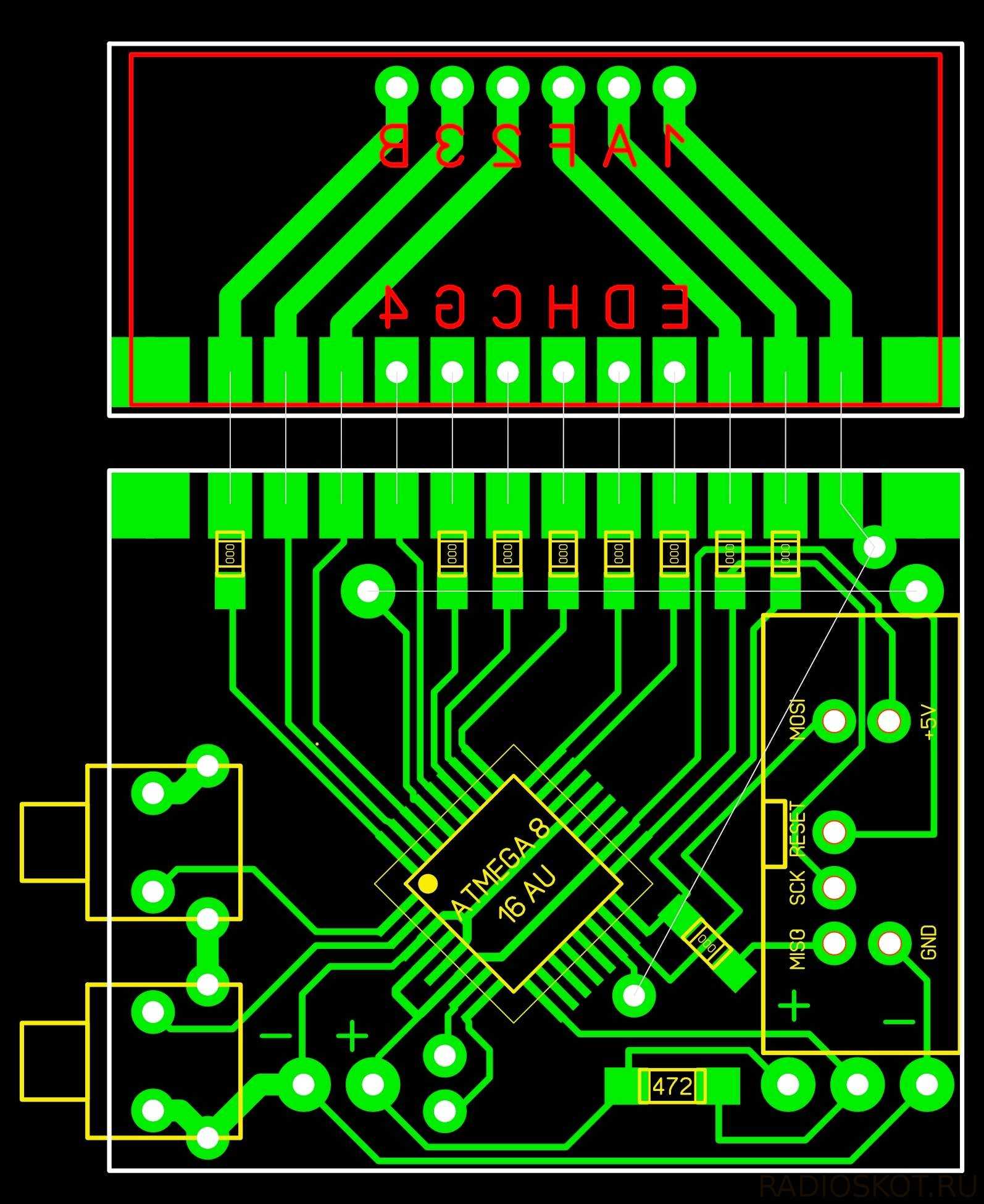 Двухсторонняя печатная плата имеет размеры 109 × 23 мм. В бесплатной версии среды проектирования печатных плат Eagle в библиотеке компонентов отсутствуют семисегментные светодиодные индикаторы, поэтому они были нарисованы автором вручную. Как видно на фотографиях (Рисунки 5, 6, 7) авторского варианта печатной платы, дополнительно необходимо выполнить несколько соединений монтажным проводом. Одно соединение на лицевой стороне платы – питание на вывод Vcc микроконтроллера (через отверстие в плате). Еще два соединения на нижней стороне платы, которые используются для подключения выводов сегмента десятичной точки индикаторов в 4 и 7 разряде через резисторы 330 Ом на «землю». Для внутрисхемного программирования микроконтроллера автор использовал 6-выводный разъем (на схеме это разъем изображен в виде составного JP3 и JP4), расположенный в верхней части печатной платы. Этот разъем не обязательно припаивать к плате, микроконтроллер можно запрограммировать любым доступным способом.