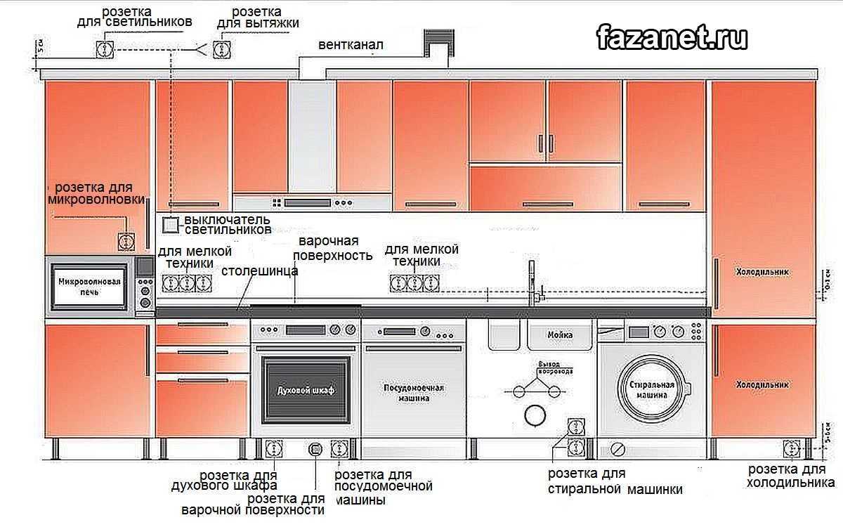 - Розетки под осветительные приборы навесных шкафов удобно размещать на высоте около 5-10 см над мебелью.