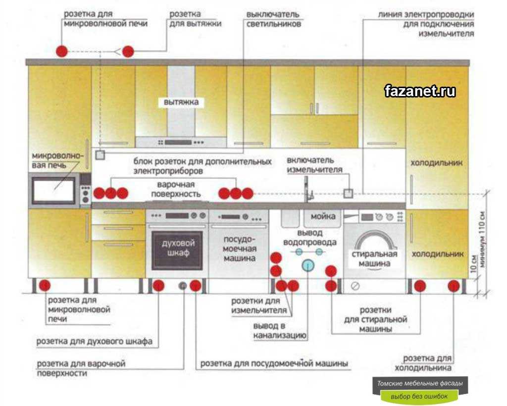 - Суммарная мощность электрических линий, подводимых к кухне, должна быть с запасом, чтобы иметь возможность включать одновременно все точки потребления: