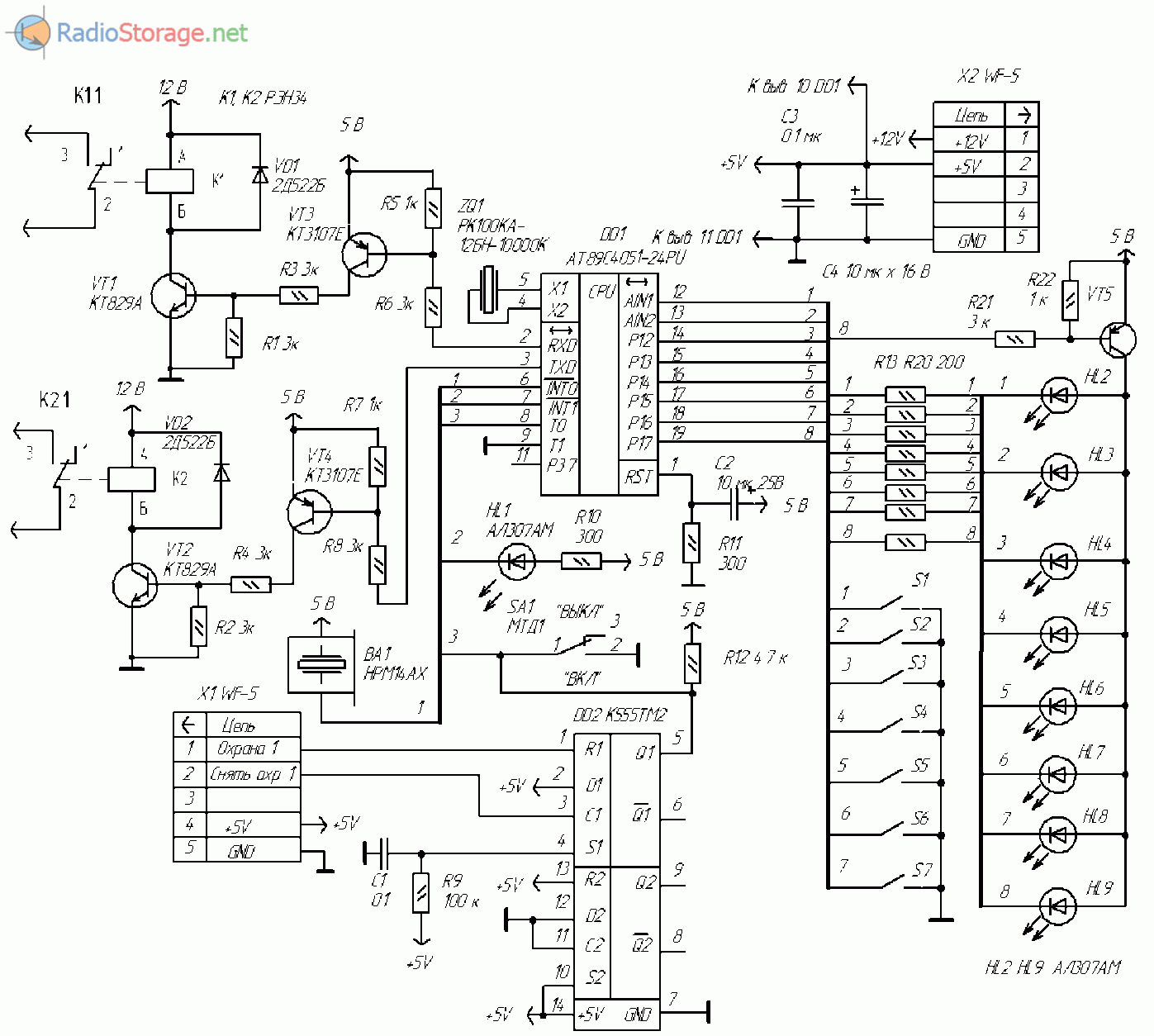 Если включится любой из концевых выключателей S1…S7 ( будет открыта любая дверь) то на соответствующем выводе порта Р1 микроконтроллера DD1 будет присутствовать сигнал уровня логического 0. Через ~ 10 сек. с момента замыкания концевого выключателя включится звуковая сигнализация (пьезоэлектрический излучатель ВА1).