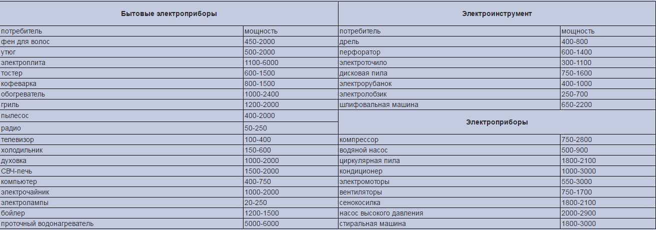 Все электроприемники которые имеют в своей конструкции двигатели (холодильник, стиральная машинка и т.п.) обладают такой характеристикой как пусковой ток. Он в несколько раз больше номинального значения. Поэтому их паспортную мощность нужно умножать минимум на 3!