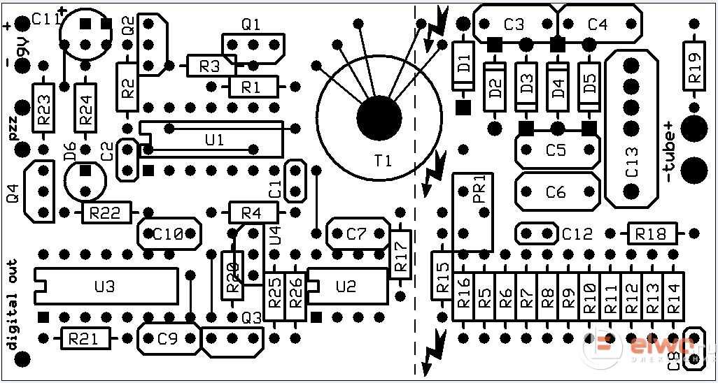 Счетчик радиации состоит из двух электродов, ионизирующая частица создает искровой промежуток между ними, чтобы уменьшить величину тока, которая возникает в этой ситуации, последовательно с трубкой ставится резистор. Отмечен по схеме как R5. Есть разные способы получения сигнала от трубки, в представленном здесь, резистор соединены последовательно между трубой и землей, изменения напряжения на резисторе измеряется с помощью детектора. Этот резистор обозначен как R6.