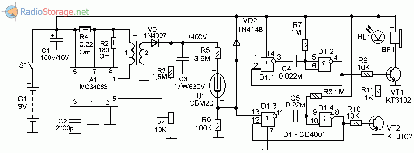 Напряжение 400V поступает на счетчик Гейгера U1 через токоограничительный резистор R5. Этот резистор нужен потому, что в ждущем состоянии сопротивление счетчика Гейгера стремится к бесконечности. Но при пролете сквозь него заряженной частицы происходит его короткий пробой, во время которого его сопротивление низко.