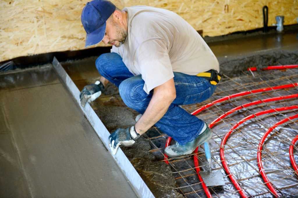 - укладывание бетонной смеси для стяжки. Сама стяжка устанавливается на уровне не ниже 3 и не выше 15 см над трубами. В продаже имеется уже готовая специализированная смесь для стяжки пола;
