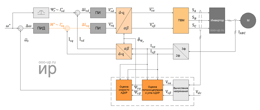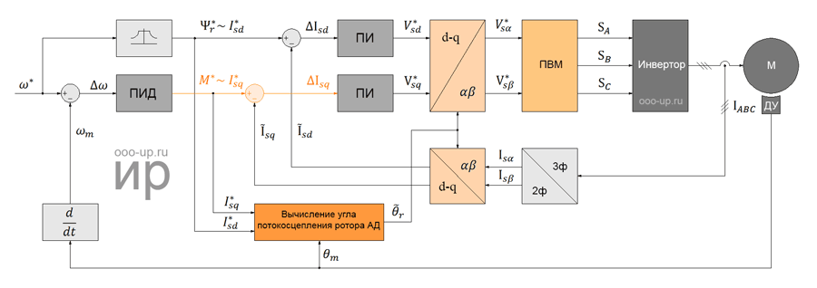 Полеориентированное управление позволяет плавно и точно управлять параметрами движения (скоростью и моментом), но при этом для его реализации требуется информация о направлениии вектора потокосцепления ротора двигателя.