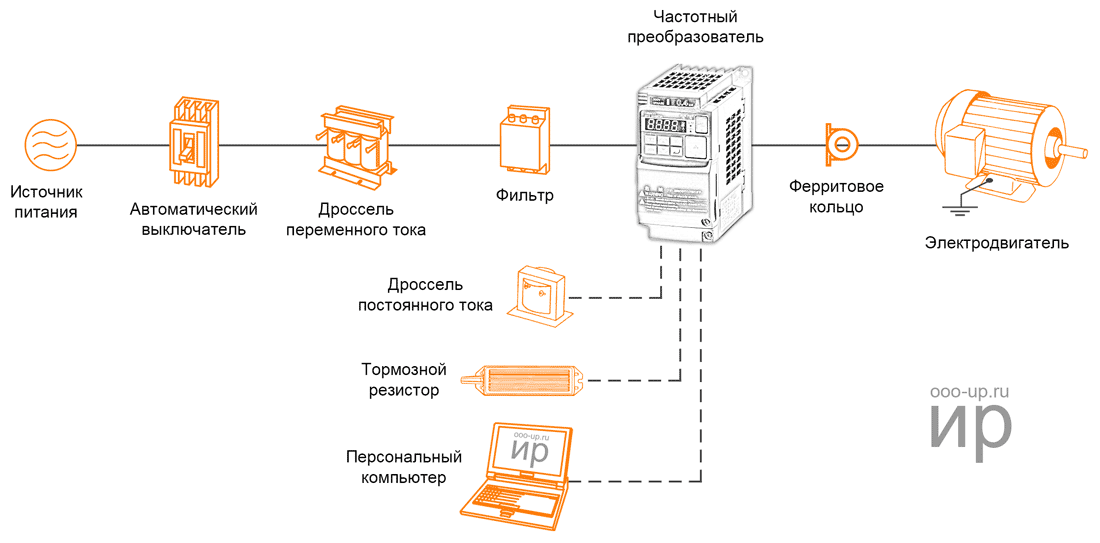 В задачах, где не требуется регулировка скорости электродвигателя во время работы для уменьшения пусковых токов используется устройство плавного пуска.
