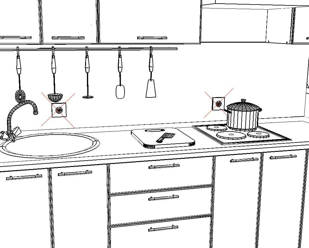 - расположение сразу над столешницей усложняет процесс использования электроточками, кроме того, на них постоянно попадает мусор, что может приводить к неприятным результатам. Чаще монтаж проводится на высоте от 10 см от столешницы;